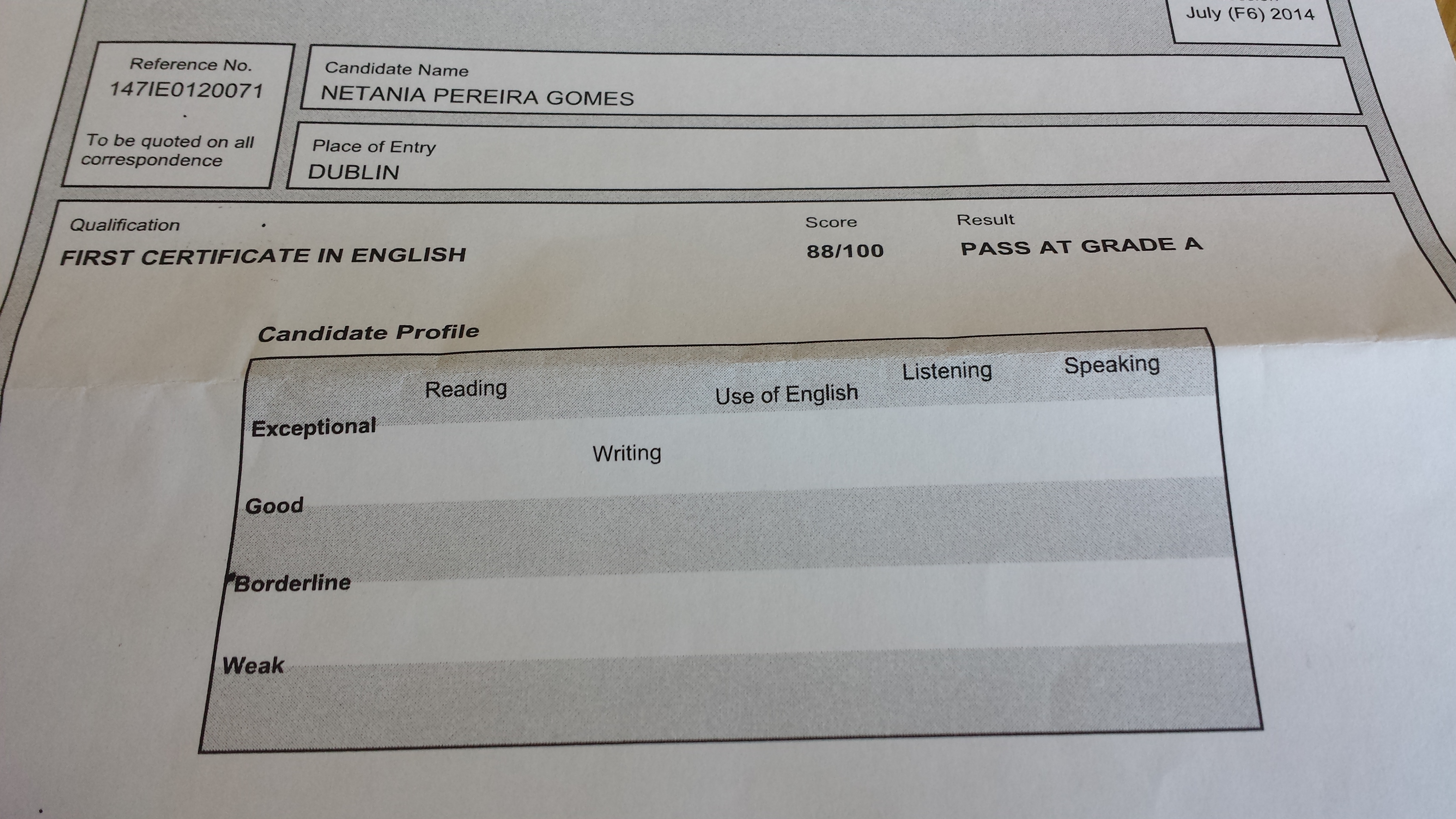 3 – Fazer o teste de inglês FCE (Fist Certificate in English): OK!!!!!!! 🙂 🙂 🙂 Sempre achei que as pessoas estavam sendo educadas quando falam que meu inglês é bom, mas agora sim eu acredito! Fiquei super feliz com o resultado 88/100 e olhe que eu nem me preparei tanto assim. Dá pra ver pela nota do teste escrito hehehehe