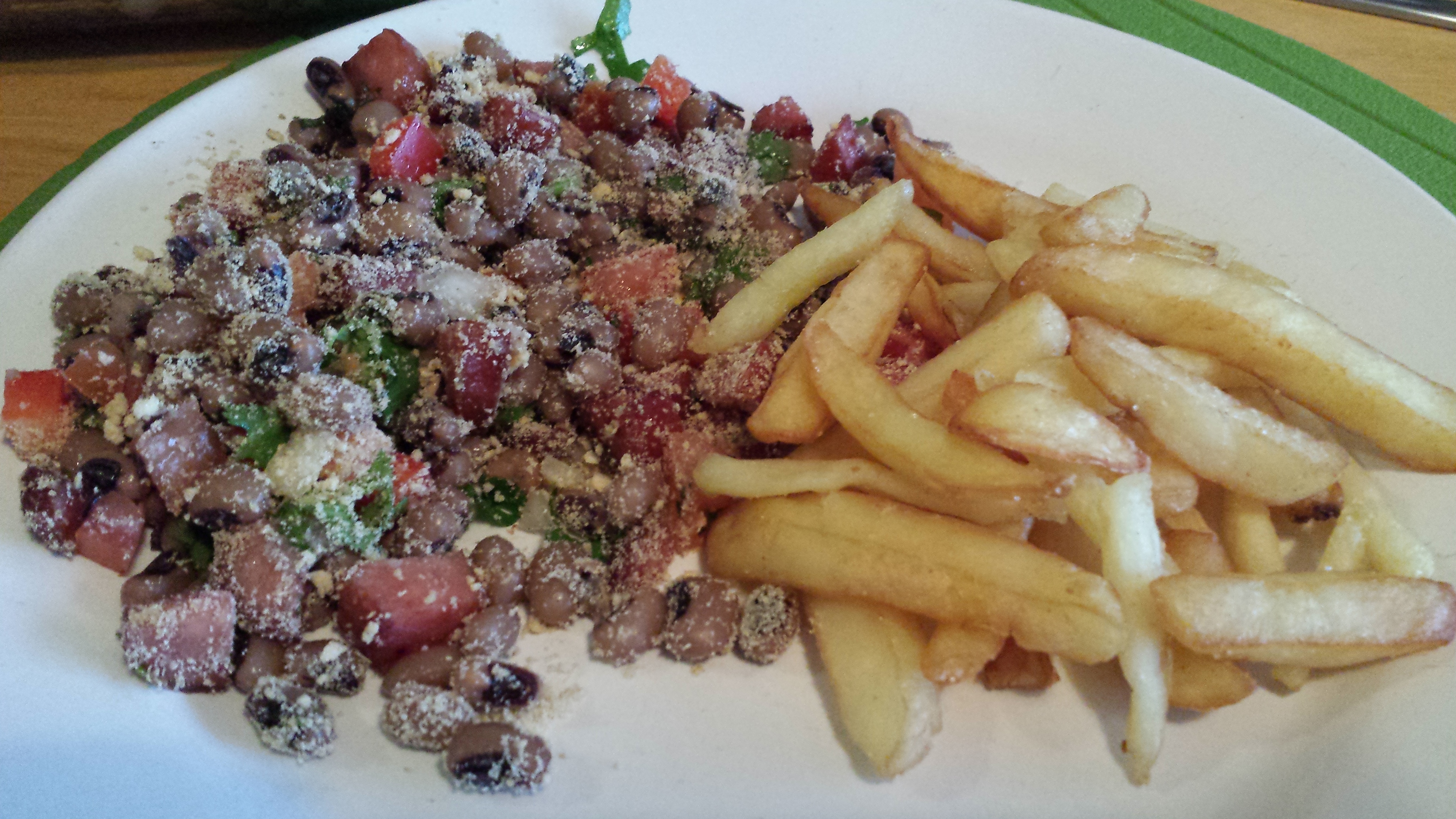 300 g de feijão macassa – também conhecido como fradinho. (eu compro no Tesco, se chama Black Eyed Beans, custa menos de €2,00 o pacotinho com meio quilo e fica na parte de grãos saudáveis do Tesco).